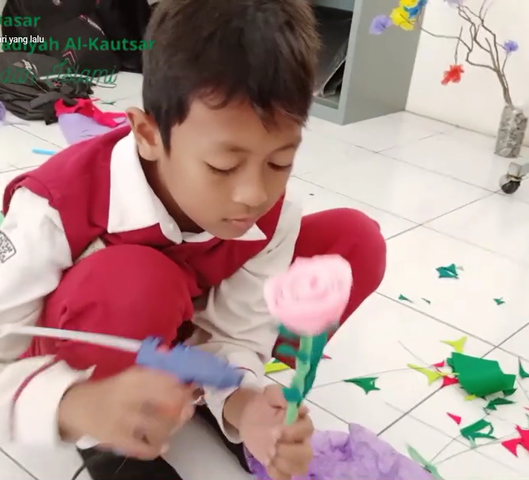 Seperti yang tampak pada gambar, salah satu siswa kami tengah fokus merampungkan karya bunga dari kertas krep. Dengan penuh ketelitian, ia menggunakan lem tembak untuk merekatkan setiap kelopak, mengubah lembaran kertas sederhana menjadi sebuah karya yang indah. Momen seperti inilah yang sangat berharga dalam proses belajar.
